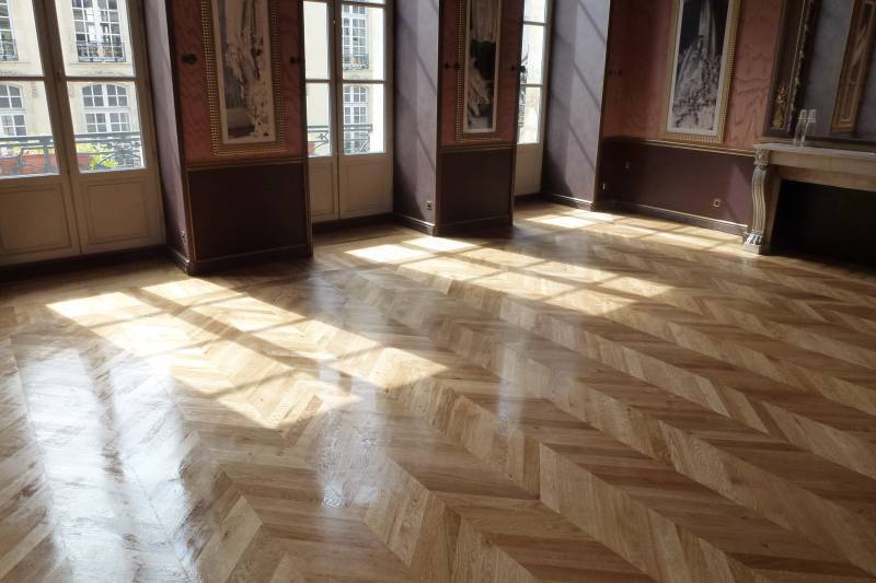 Exemple de réalisation : Mise en oeuvre collée d’un parquet en chêne massif point de Hongrie au grand Hotel de