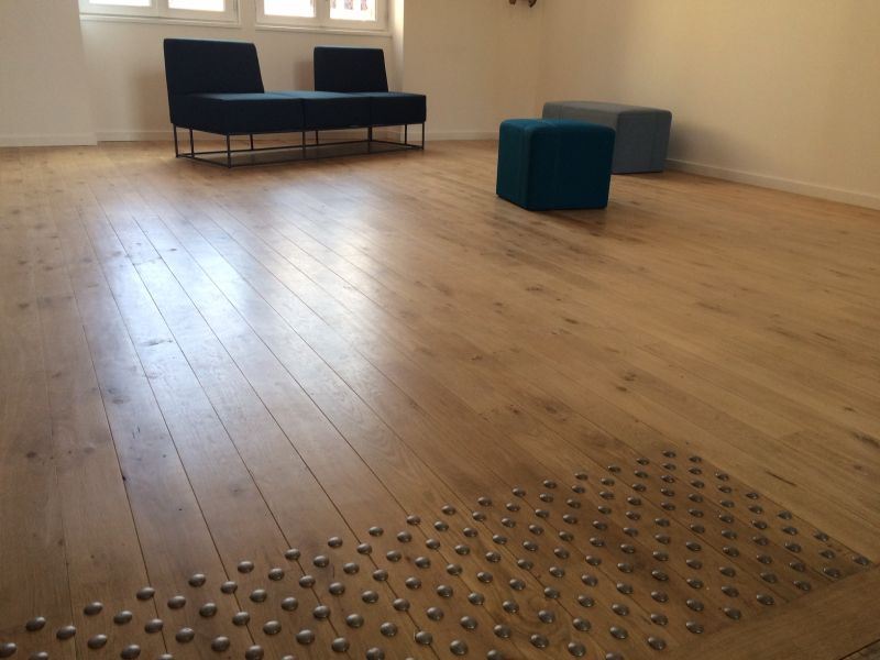 Exemple de réalisation : Insertion d’une bande de vigilance composée de 300 clous podotactiles incorporés dans le parquet au centre