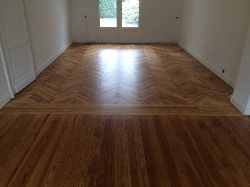 Restauration d’un parquet en pitchpin dans une maison à étage à Bordeaux Suite à la démolition de 2 murs il a